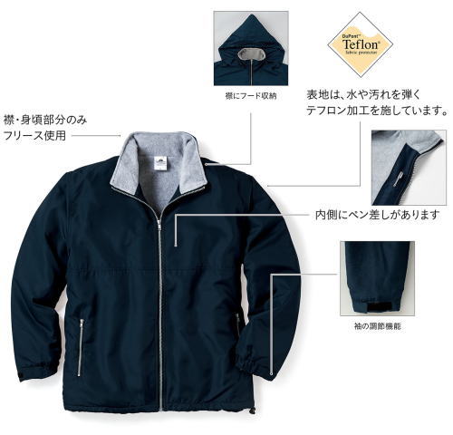 | 素材 表地:ポリエステル100%高密度タフタ 身頃裏:ポリエステル100%フリース 袖裏:ナイロン100%タフタ |