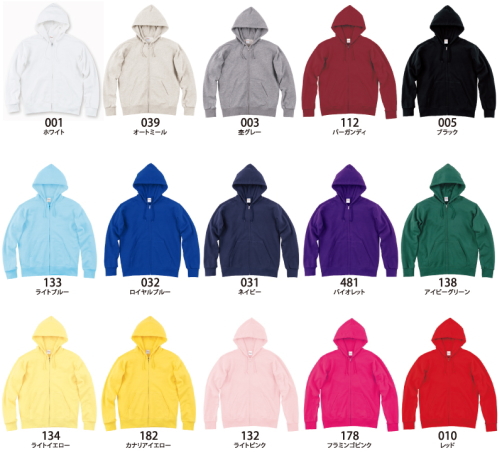 | 素材:285gm2(8.4oz)裏毛 杢グレー:綿90%ポリ10% その他:綿100% |